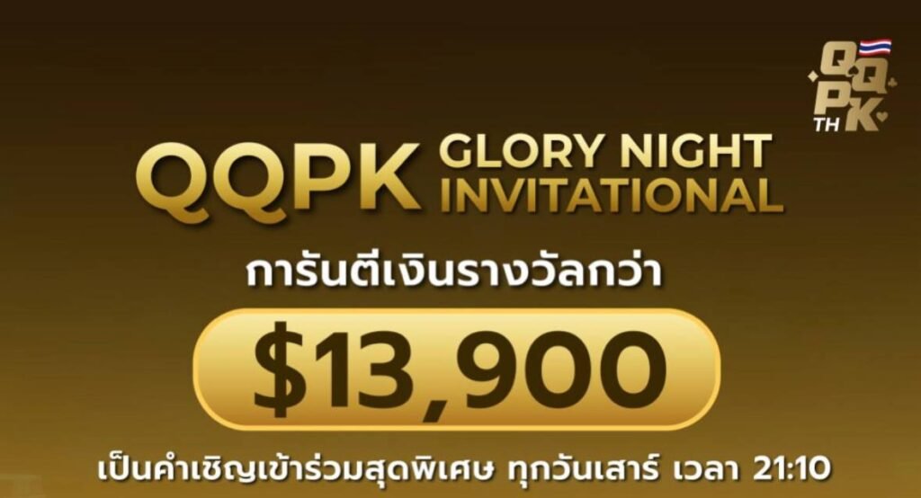 QQPK GLORY NIGHT INVITATIONAL การันตีเงินรางวัลรวมกว่า $13,900 เป็นคำเชิญสุดพิเศษ ในทุกวันเสาร์ วิธีรับคำเชิญ ฝากเงินตั้งแต่ $100 ขึ้นไป รับสิทธิ์คำเชิญอัตโนมัติ ติดตาม INSTAGRAM QQPK OFFICIAL และที่สำคัญ อย่าลืมอ่านหมายเหตุ ติดต่อสอบถามได้ที่ @qqpk.th