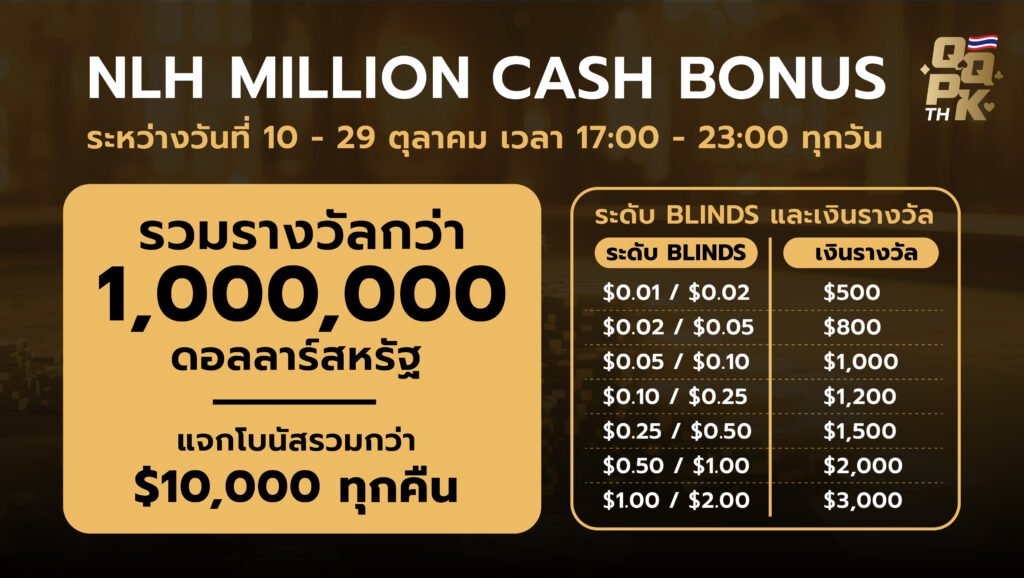 NLH CASH MILLION BONUS แจกโบนัสรวมกว่า $1,000,000 ลุ้นรับ $10,000 ในทุกค่ำคืน ยิ่ง Blinds สูง เงินรางวัลยิ่งใหญ่ เล่นหลายโต๊ะ ลุ้นรางวัลได้หลายรอบ เล่นจริง แจกจริง ที่ QQPK เท่านั้น ติดต่อสอบถามได้ที่ @qqpk.th